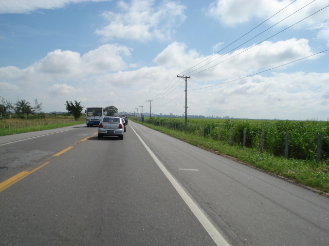 Saimos da cidade e tomamos o rumo para voltar à BR101. Na estrada no caminho houve um pequeno susto, pois havia uma deformação na estrada que formou uma rampa… na hora pareceu que ia arrebentar com tudo de suspensão, amortecedores, mas felizmente ficou só no susto - Esqueci de citar mas houve episódio parecido na saída do Rio de Janeiro, outro buraco imenso numa via de acesso. Nem todos devem saber mas eu tenho um certo trauma por causa de um pequeno acidente que tive no começo de 2008, mas isso é outra história.